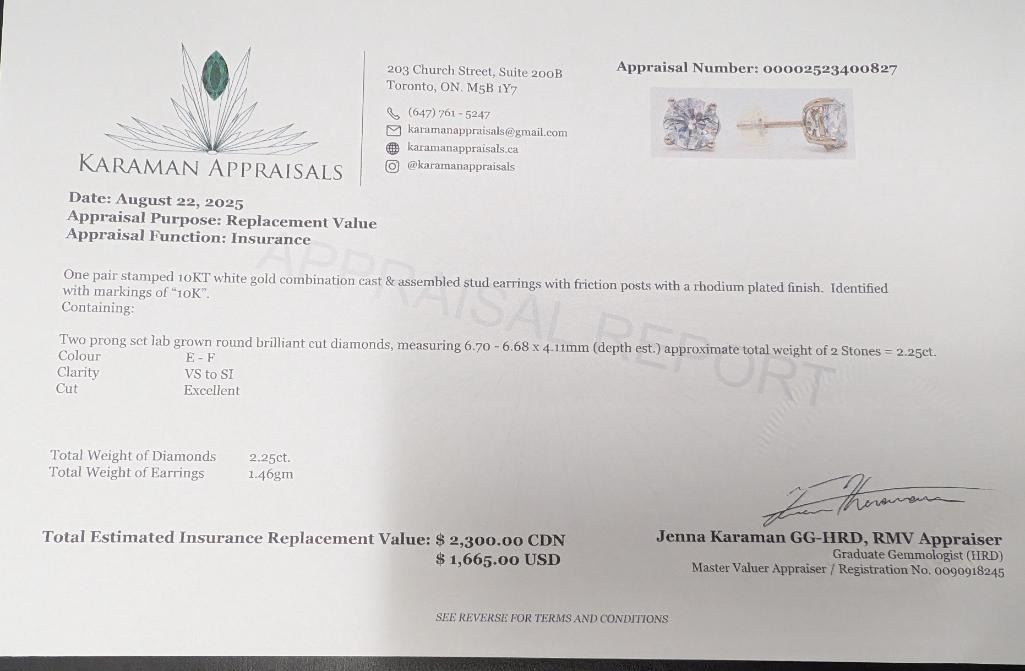 $2300, 10K(1.46g), LAB DIAMOND (2.25ct) EARRING, appraised value $2300