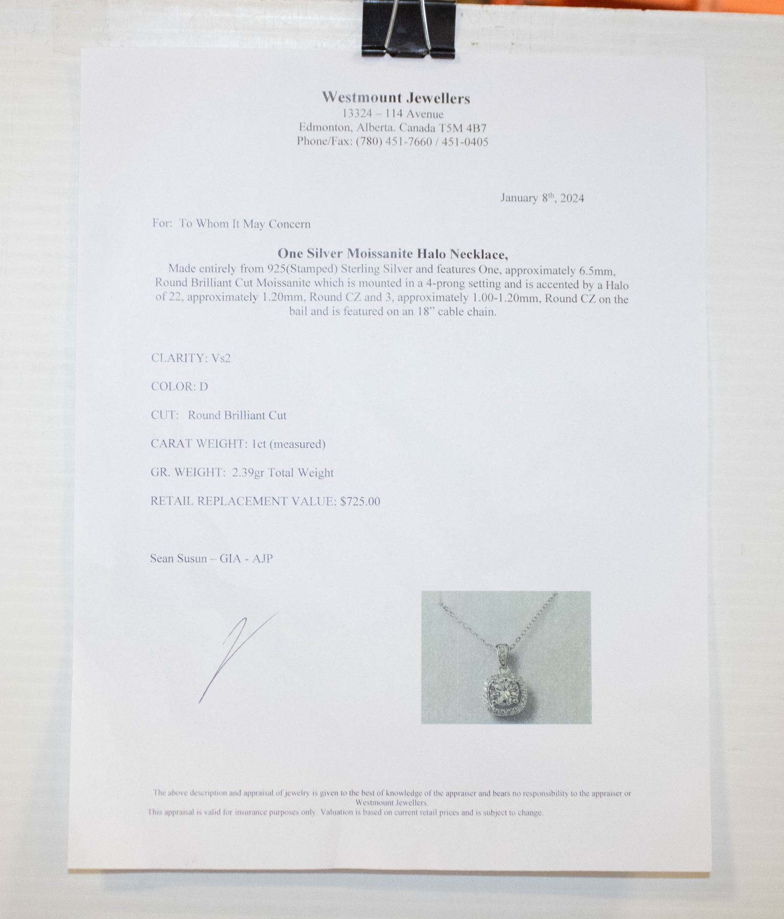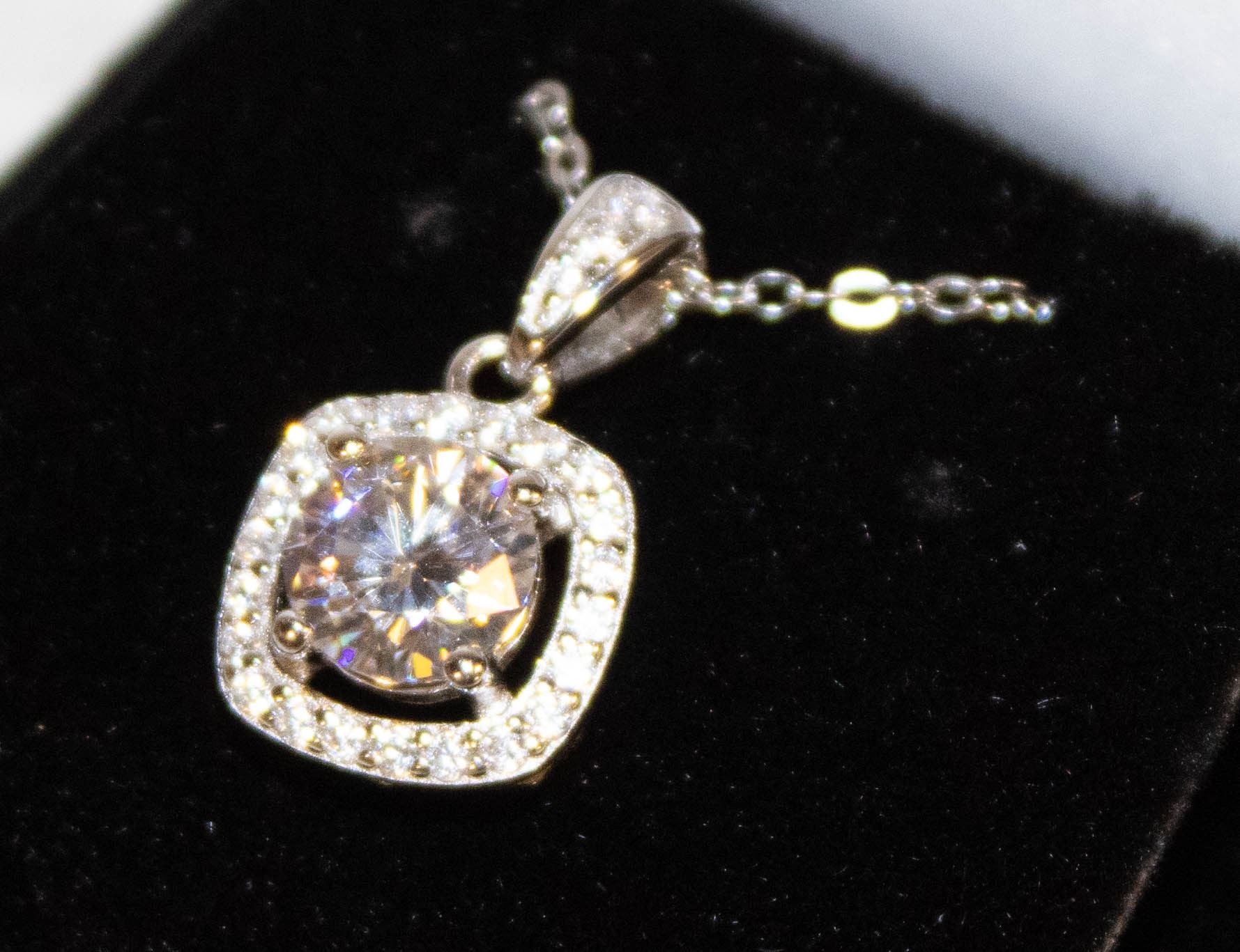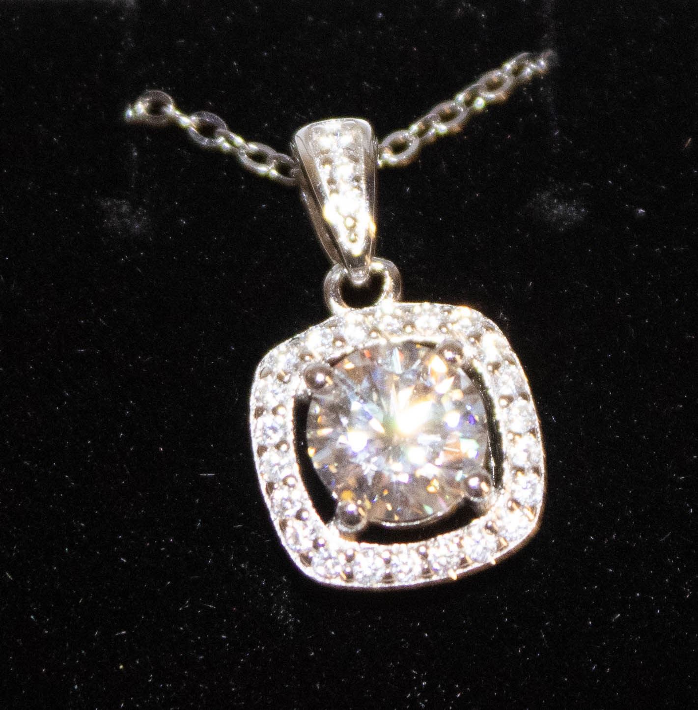 VS WITH HALO WITH 22 CUBIC ZIRCONIUM SURROUNDING THE CENTER WITH 3 MORE IN THE BAIL ALL SET IN 925 STERLING SILVER APPRAISED VALUE $725.00