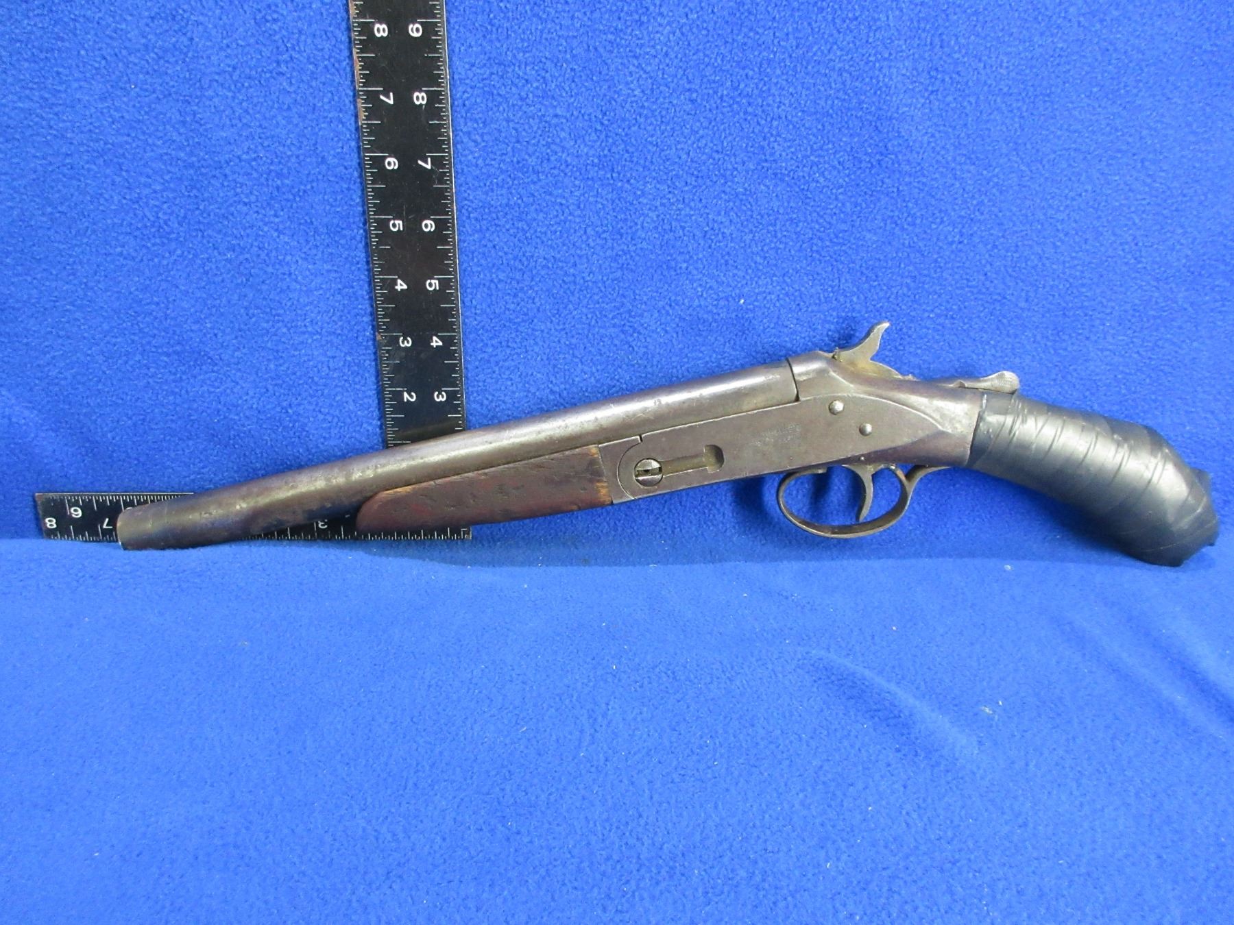 No PAL Required - Deactivated Hopkins & Allen Shotgun - Unknown Gauge - This single shot shotgun has trigger, hammer and muzzle welded. Barrel has been cut and stock has been modified to pistol grip and is taped.