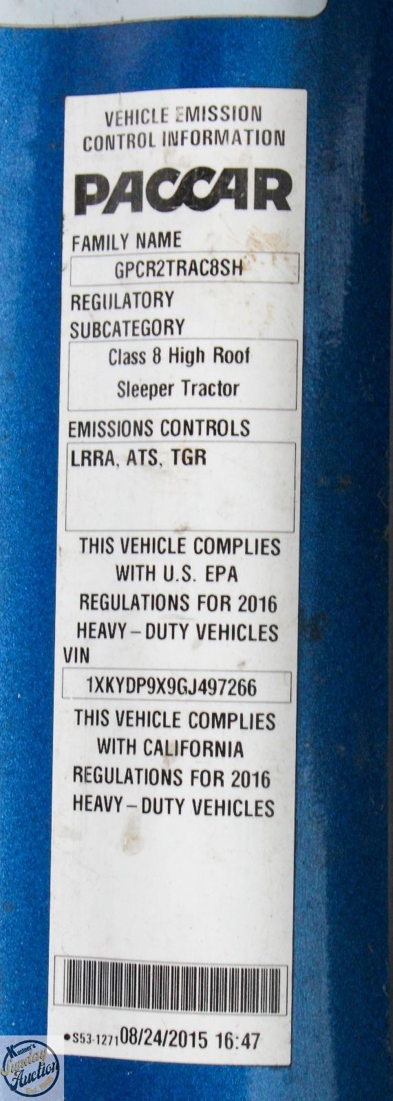 Paccar MX-13 6 Cylinder 12.9 L Diesel 450 hp Engine, 15181 Engine hrs, Engine Brake, Eaton Fuller RTLO-16913A 13-Speed Manual Transmission, Differential Lock, 5988 kg Front Axle, 18144 kg Rears, Dana DSP40 Drive Axles, 3.70:1 Axle Ratio, 24132 kg GVWR, Air Ride Cab, 42 in High Rise Sleeper Cab, Bunk Heater, Aluminum Wheels, 11R22.5, Paccar Air Ride Suspension, 223 in Wheelbase, Air Sliding 5th Wheel, Headache Rack, Dual Fuel Tanks